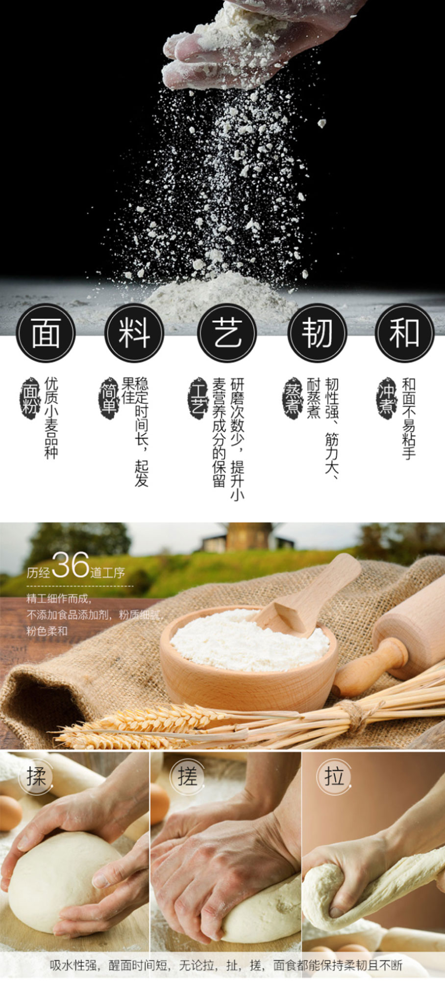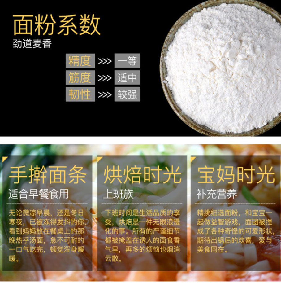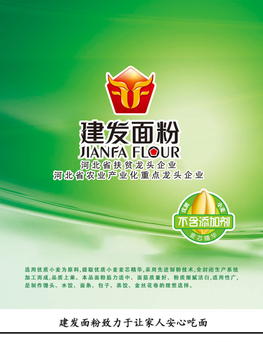 选用优质小麦为原料,提取优质小麦麦芯精华,采用先进制粉技术,全封闭生产系统加工而成,品质上乘。本品面粉筋力适中、面筋质量好、粉质细腻洁白,适用性广,是制作馒头、水饺、面条、包子、蒸饺、金丝花卷的理想选择。