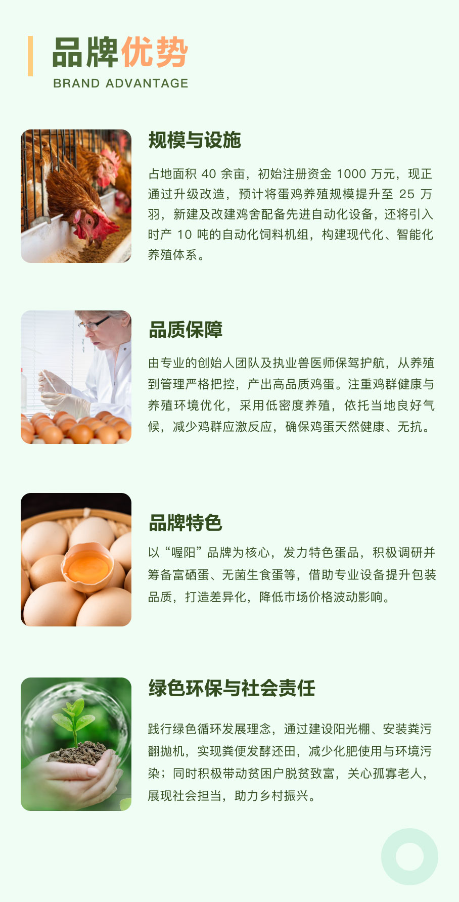 占地面积 40 余亩,初始注册资金 1000 万元,现正通过升级改造,预计将蛋鸡养殖规模提升至 25 万羽,新建及改建鸡舍配备先进自动化设备,还将引入时产 10 吨的自动化饲料机组,构建现代化、智能化养殖体系。