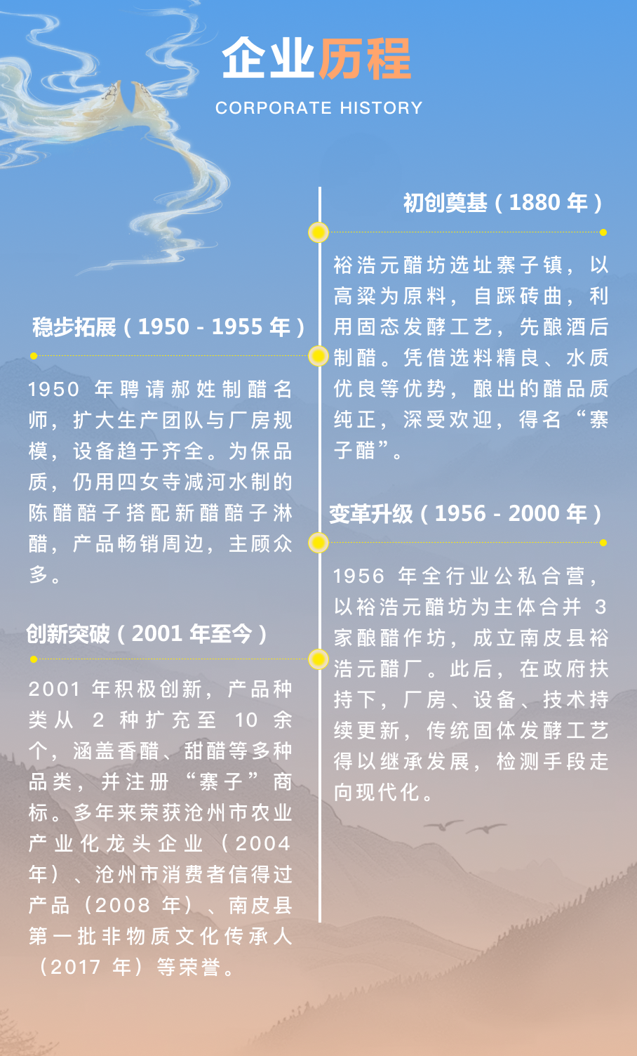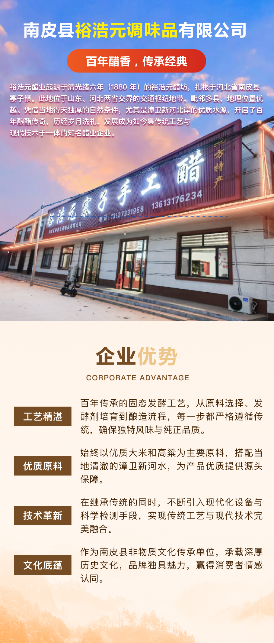 裕浩元醋业起源于清光绪六年(1880 年)的裕浩元醋坊,扎根于河北省南皮县寨子镇。此地位于山东、河北两省交界的交通枢纽地带,毗邻多县,地理位置优越。凭借当地得天独厚的自然条件,尤其是漳卫新河北岸的优质水源,开启了百年酿醋传奇,历经岁月洗礼,发展成为如今集传统工艺与现代技术于一体的知名醋业企业。